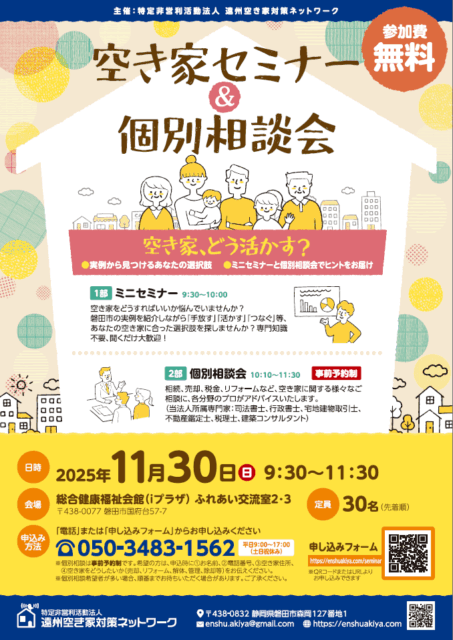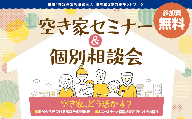 「空き家、どう活かす?」をテーマに、磐田市の実例を紹介しながら「手放す」「活かす」「つなぐ」等、あなたの空き家に合った選択肢を探すミニセミナーを行います。